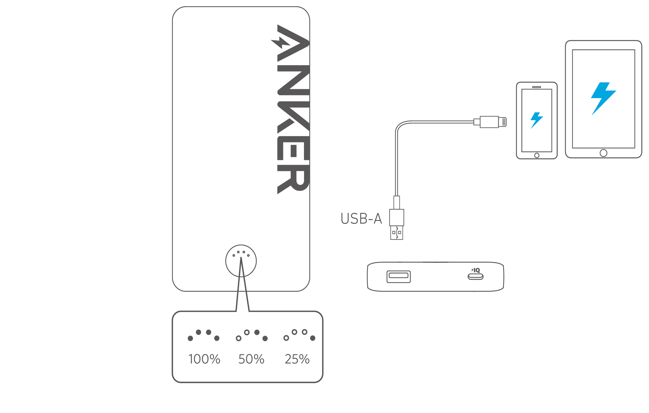 عندما يتم شحن بنك الطاقة بالكامل، سيتم إيقاف تشغيل مؤشرات LED.