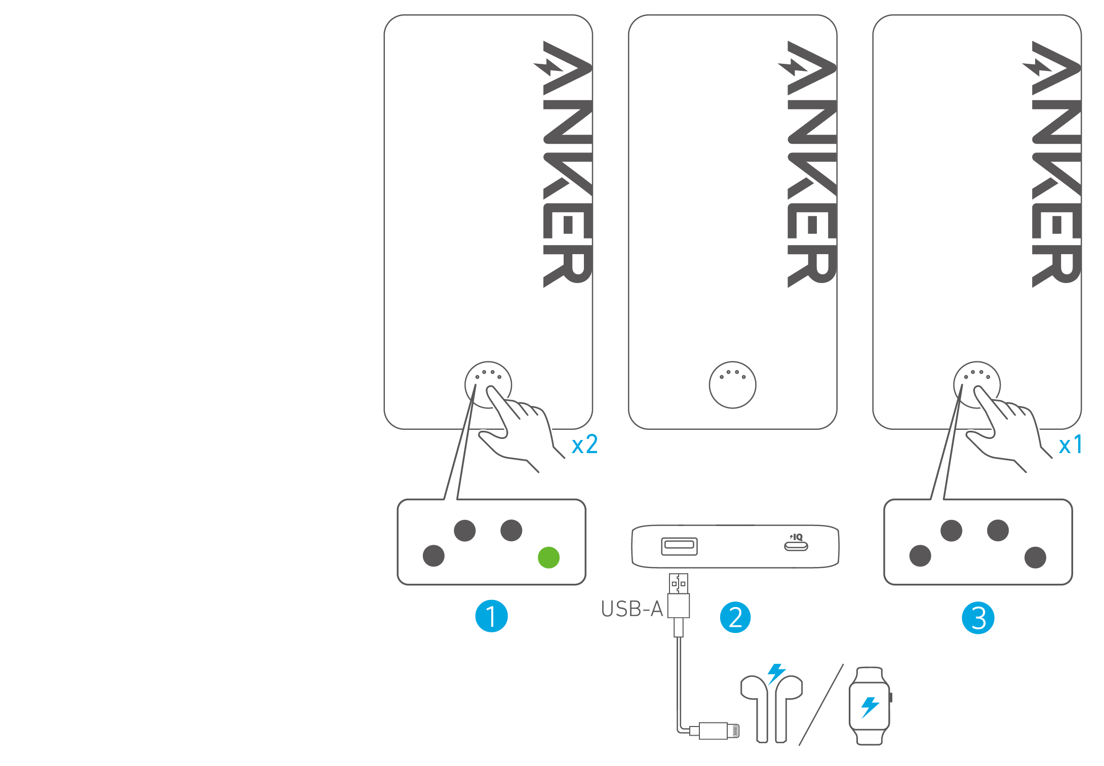 ・ يتم الدخول إلى وضع الشحن التدريجي عن طريق الضغط على زر الطاقة مرتين. سيتحول مؤشر LED إلى اللون الأخضر.