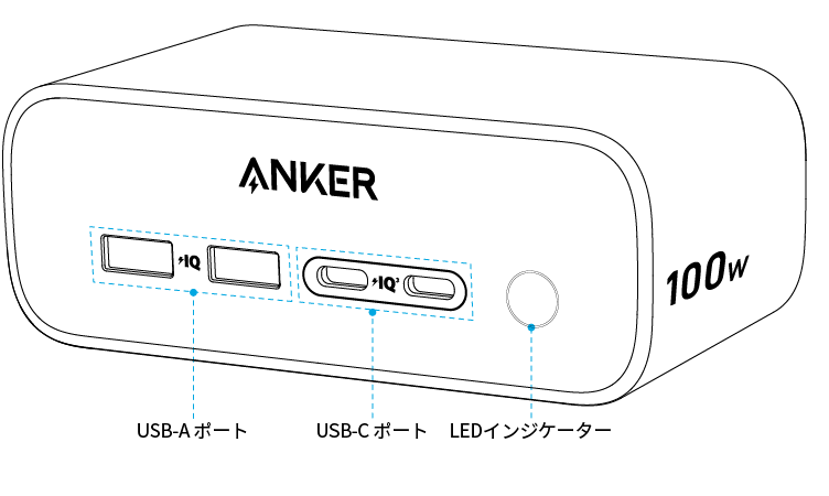 USB-C1 + USB-C2 + USB-A1 /USB- A2 出力 : 最大45W + 最大30W + 最大12W USB-C1 / USB-C 2 + USB-A1 + USB-A2 出力 : 最大45W + 最大12W |