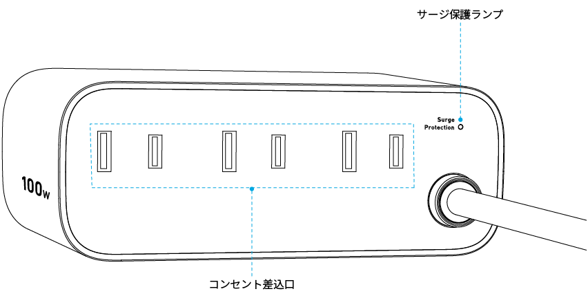 •本製品をコンセントに接続するとサージ保護ランプが白色に点灯します。