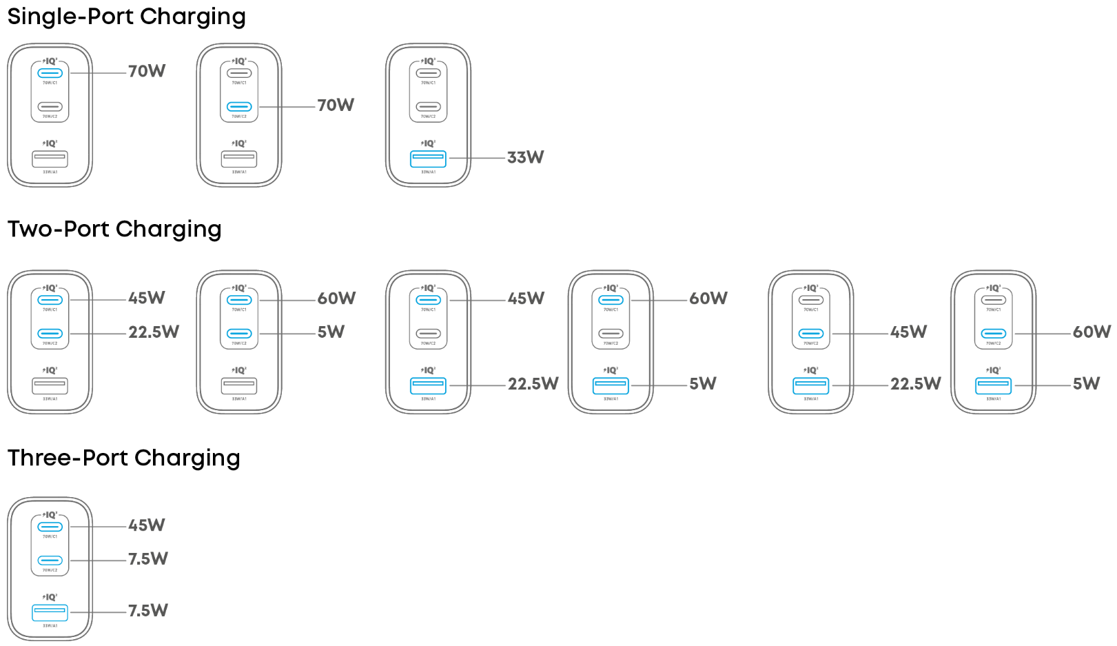 Q1: What should I do if the charging power does not reach 70W when using multiple ports?