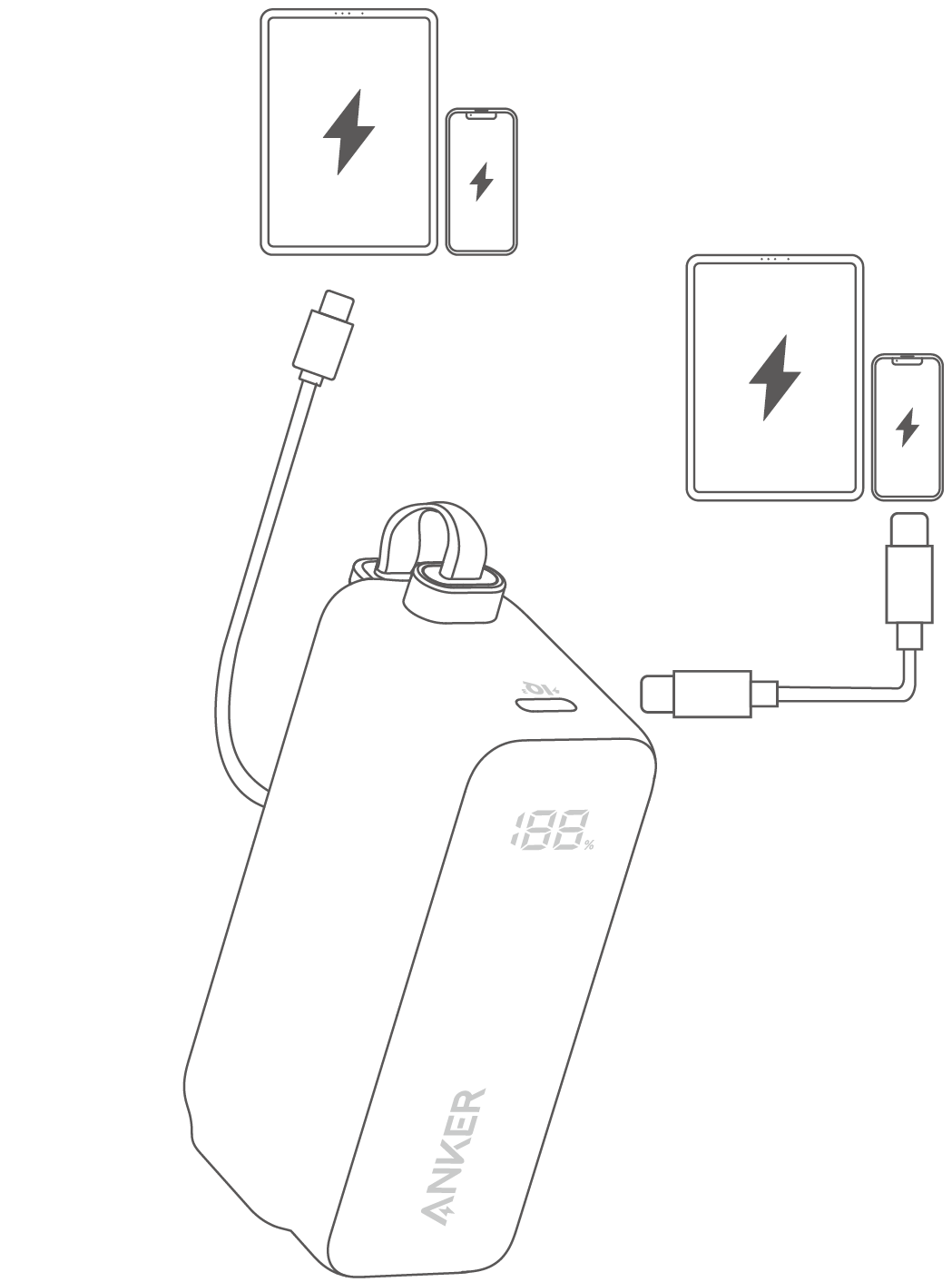 Charge your devices via the built-in USB-C cable or USB-C port.