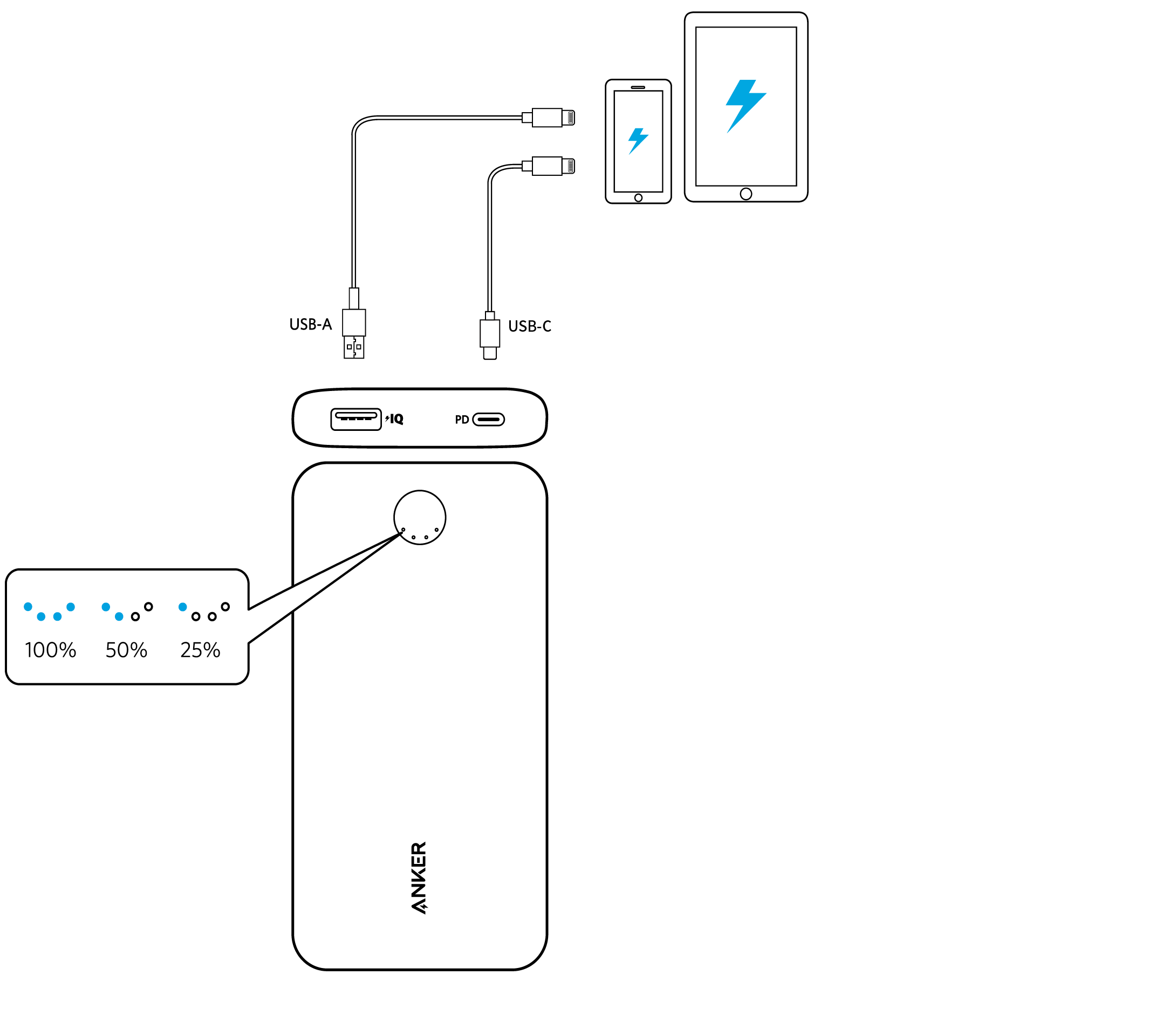 Încărcați PowerCore-ul dvs. printr-un încărcător PD (nu este inclus).