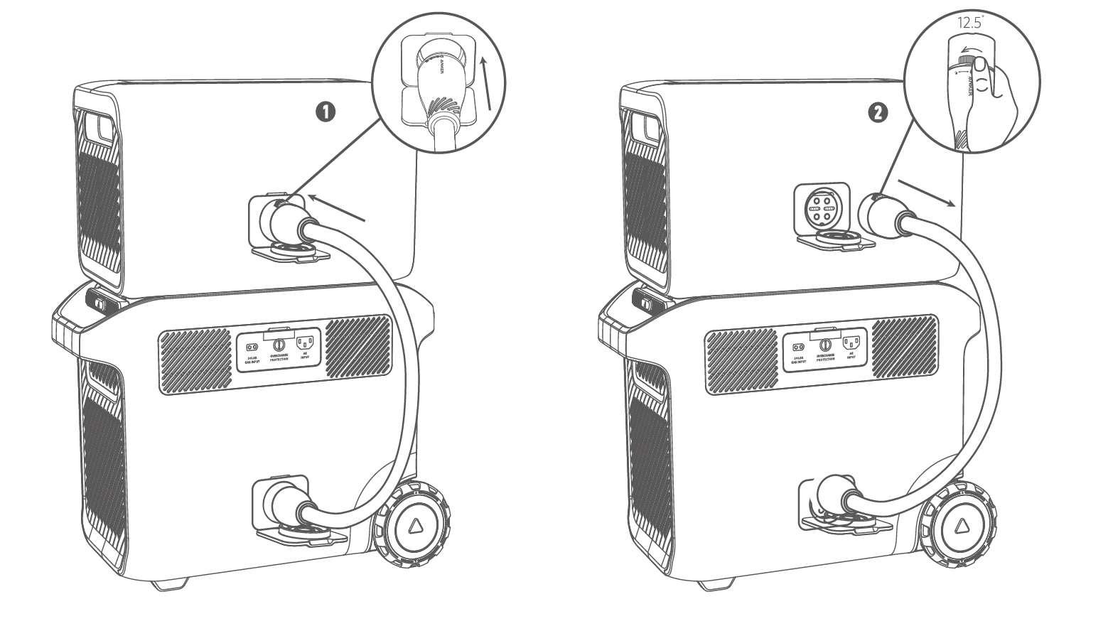 4.إذا كنت بحاجة إلى فصل أو قطع اتصال بطارية التمديد عن محطة الطاقة عندما تكون قيد الاستخدام، فاضغط على زر التشغيل/إيقاف التشغيل لمدة ثانيتين لإيقاف تشغيل البطارية لتجنب حدوث ماس كهربائي. لفصله، ادفع المقبض الموجود في منتصف الكابل وأدره بمقدار 12.5 درجة عكس اتجاه عقارب الساعة قبل سحبه للخارج.