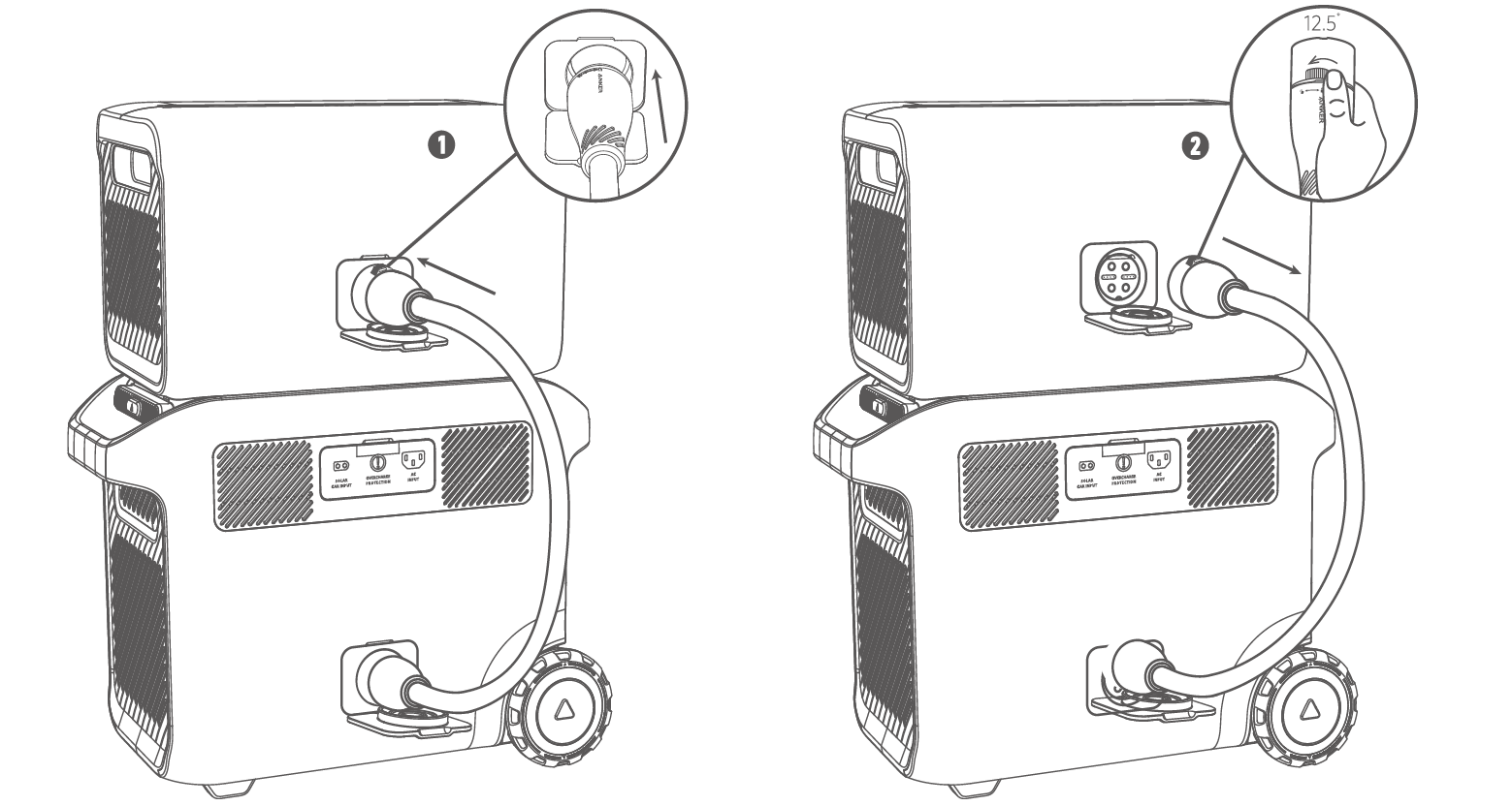 4. Wenn Sie den Erweiterungsakku von der Stromversorgungseinheit trennen müssen, während die Geräte in Betrieb sind, drücken Sie die Ein-/Ausschalttaste 2 Sekunden lang, um den Akku auszuschalten und einen Kurzschluss zu vermeiden. Drücken Sie zum Trennen auf den Knopf in der Mitte des Kabels und drehen Sie es um 12,5 Grad gegen den Uhrzeigersinn, bevor Sie es herausziehen.