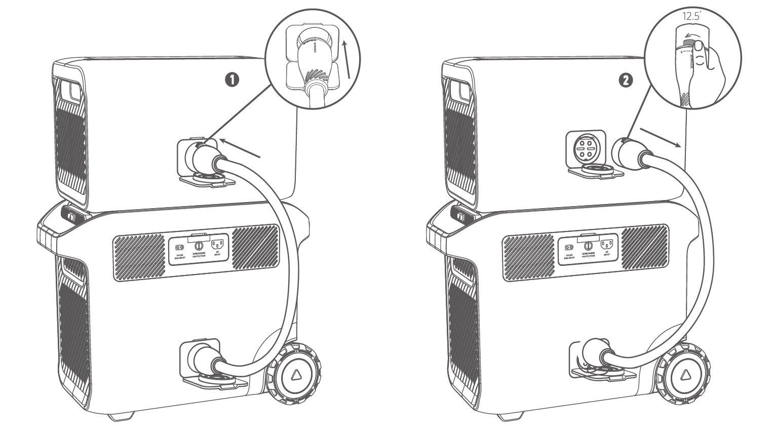 4. Si necesita desconectar o separar la batería de expansión de la estación de energía cuando esté usándola, pulse el botón de encendido/apagado durante 2 segundos para apagar la batería y evitar que se produzca un cortocircuito. Para desconectarlo, apriete el botón de la parte central del cable y gírelo 12,5 grados en el sentido contrario a las agujas del reloj antes de sacarlo.