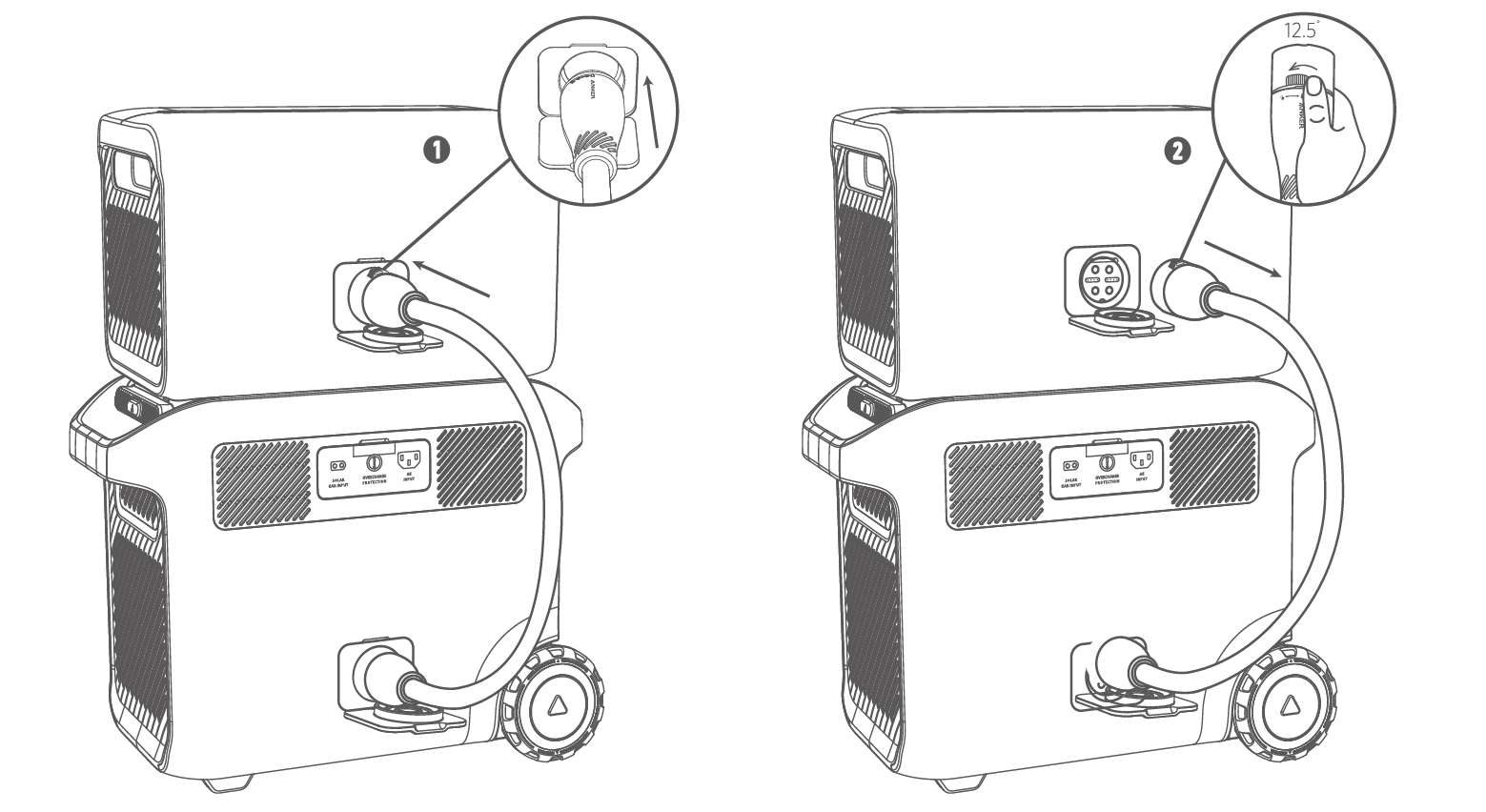 4. Se è necessario scollegare o separare la batteria di espansione dalla stazione di alimentazione quando sono in uso, premi il pulsante di accensione/spegnimento per 2 secondi per spegnere la batteria ed evitare un cortocircuito. Per scollegare, premi la manopola al centro del cavo e ruotala di 12,5 gradi in senso antiorario prima di estrarlo.