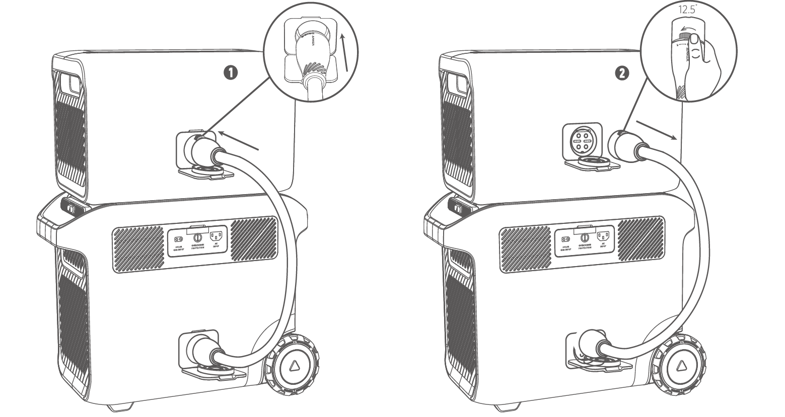 4. Si vous devez déconnecter ou séparer la batterie d’extension de la centrale électrique lorsqu’elles sont utilisées, appuyez sur le bouton marche/arrêt pendant 2 secondes pour éteindre la batterie et éviter un court- circuit. Pour le déconnecter, poussez le bouton au centre du câble et tournez-le de 12,5 degrés dans le sens inverse des aiguilles d’une montre avant de le retirer.