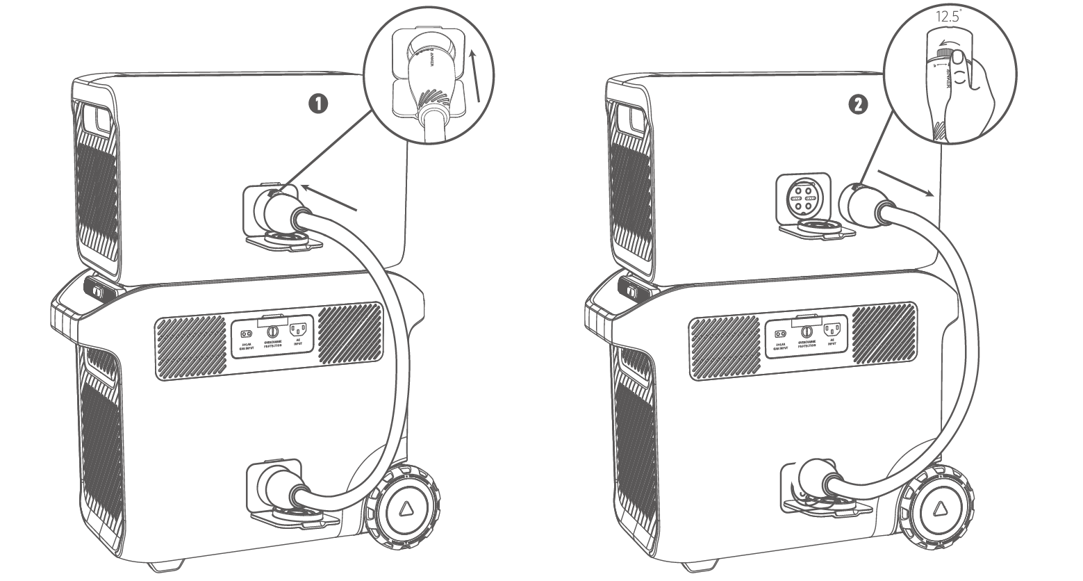 4. Genişletme pilini kullanımdayken güç istasyonundan çıkarmanız veya bağlantısını kesmeniz gerekirse kısa devreyi önlemek üzere pili kapatmak için 2 saniye boyunca açma/kapatma düğmesine basın. Bağlantıyı kesmek için kablonun ortasındaki kontrol düğmesini itin ve dışarı çekmeden önce saat yönünün tersine 12,5 derece çevirin.