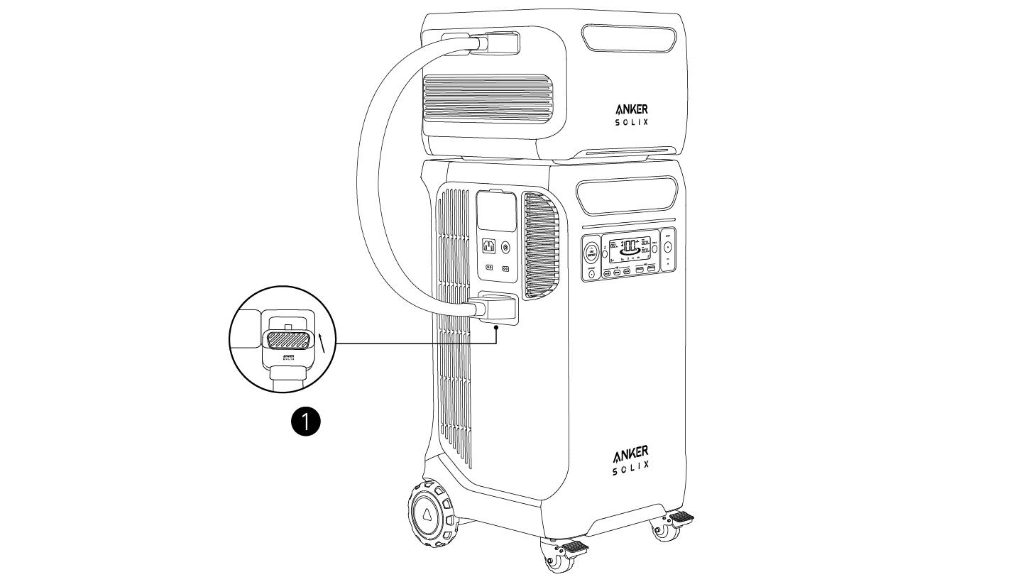 1.接続する時は、Anker SOLIXロゴを上に向けて挿入します。片方をAnker SOLIX F3800 Portable Power Stationに差し込み、もう片方を拡張バッテリーのいずれかのポートに差し込みます。