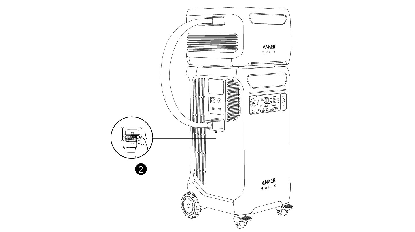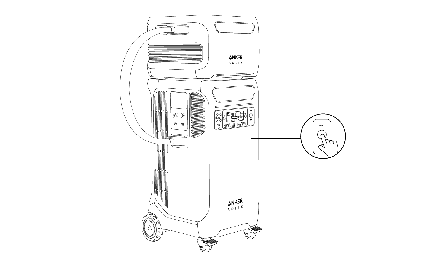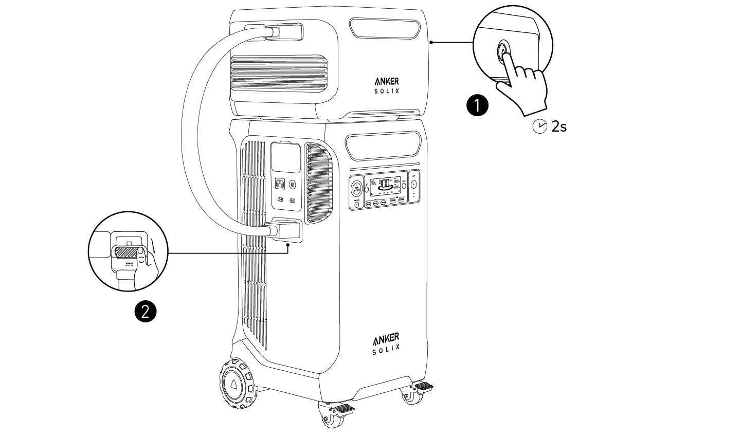 6.ショートを防ぐために、本製品とAnker SOLIX F3800 Portable Power Stationを使用中に接続を切断または再開する必要がある場合は、本製品の電源ボタンを2秒間長押しして下さい。ケーブルを外すときは黒い部分を押しながら外してください。
