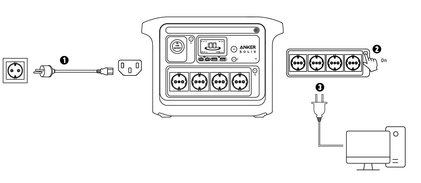 Para usar a função UPS, conecte a sua estação de energia a uma tomada de parede com o cabo de carregamento de CA, em seguida, pressione o botão da tomada de CA e conecte os seus dispositivos através das portas de saída de CA.