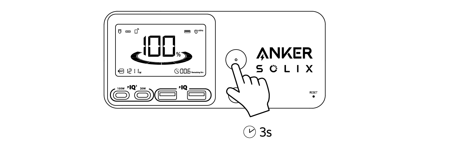 اضغط على زر الطاقة الرئيسي لمدة 3 ثوانٍ لتشغيل أو إيقاف محطة الطاقة الخاصة بك.