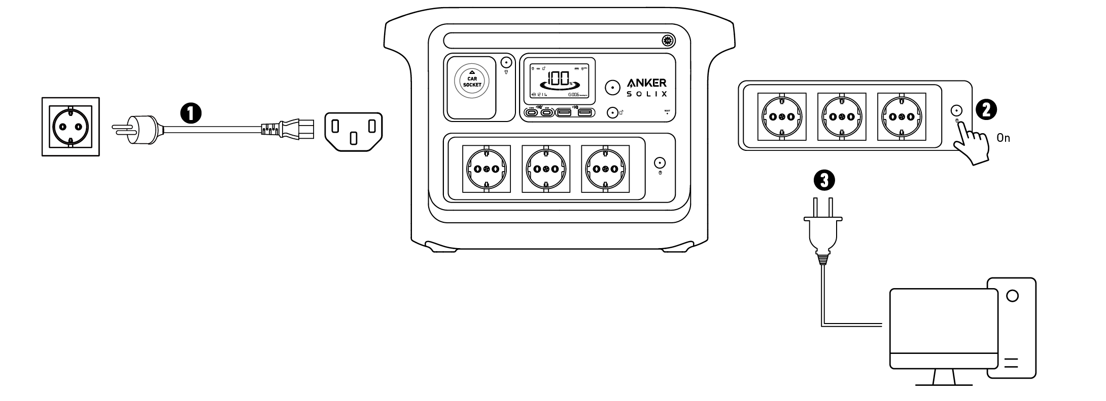 Per utilizzare la funzione UPS, collegare la tua stazione di alimentazione a una presa a muro con il cavo di ricarica AC, quindi premere il pulsante della presa AC e collegare i tuoi dispositivi tramite le porte di uscita AC.