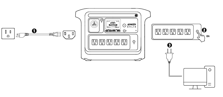 Pour utiliser la fonction UPS, connectez votre station d'alimentation à une prise murale avec le câble de charge CA, puis appuyez sur le bouton de prise de courant CA et connectez vos appareils via les ports de sortie CA.
