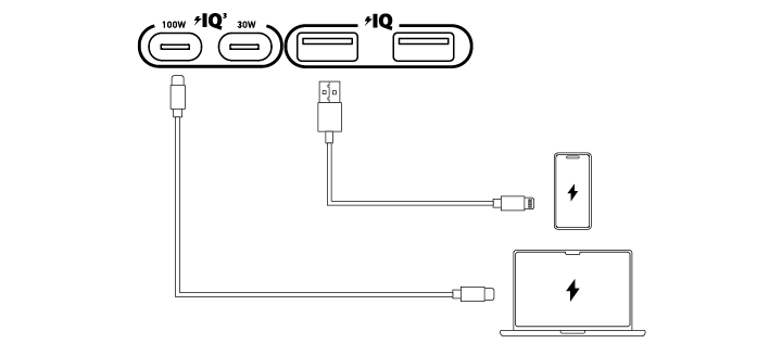 - SurgePad™ s'allume automatiquement lorsque la sortie totale dépasse la sortie nominale, permettant à la station d'alimentation de fournir une puissance nominale aux appareils à haute puissance.