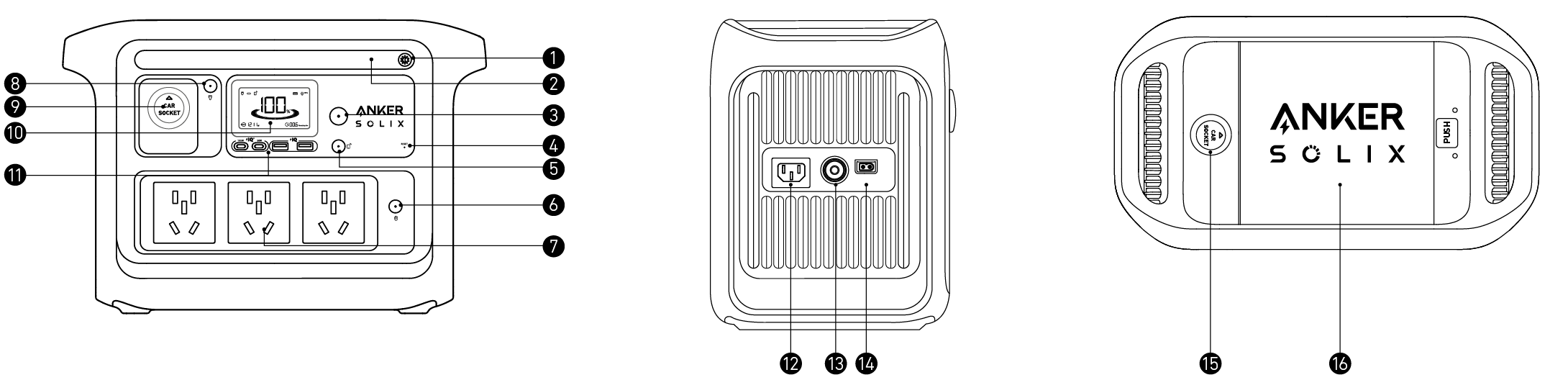•开机后,按主电源按钮可打开或关闭屏幕。 •屏幕将在点亮 30 秒后自动关闭。自动关闭时间可以在 Anker 应用程序中设置。 •如果关闭输出按钮且 12 小时内未检测到用电负载,便携电源将自动关机。待机时长可以在 Anker 应用程序中设置。 |