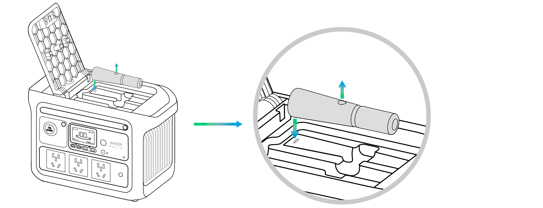 产品顶部的充电舱是露营灯的储物箱,可同时为 2 个露营灯充电。