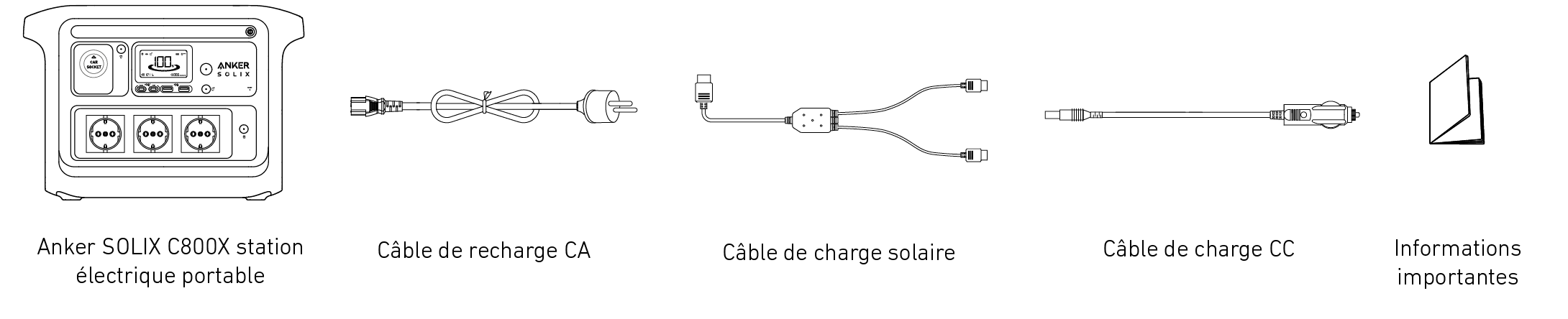 L'entrée solaire prend en charge un chargeur solaire de 11 à 60 V avec un connecteur XT-60. Le courant supporté est de 10 A maximum. Nous recommandons l'utilisation de panneaux solaires Anker (200 W ou 400 W) pour obtenir la meilleure compatibilité.