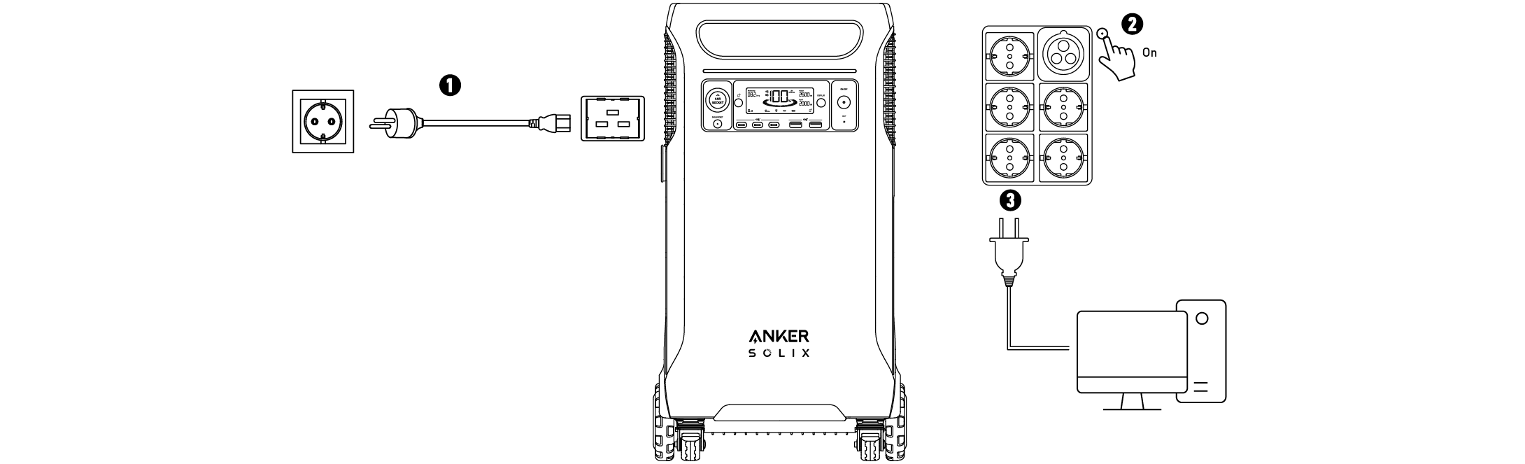 Az UPS funkció használatához csatlakoztassa a tápegységet a fali aljzathoz az AC töltőkábellel, majd nyomja meg az AC kimeneti gombot, és csatlakoztassa eszközeit az UPS AC kimeneti portjain keresztül.