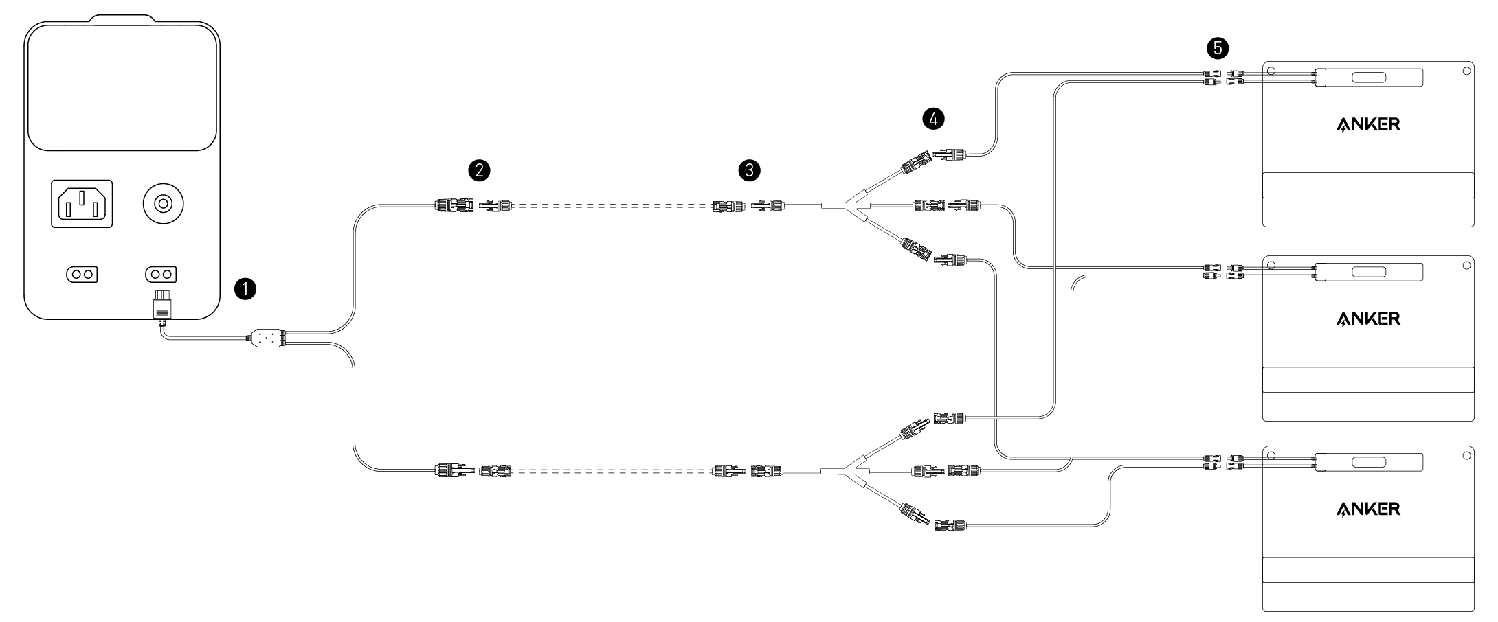 *Güneş paneli güç istasyonundan uzakta ise, Anker'in resmi web sitesinden bir uzatma kablosu olarak Anker SOLIX Güneş Paneli MC4 Şarj Kablosunu satın alabilir ve diyagramda noktalı çizgi ile gösterilen kısma bağlayabilirsiniz.
