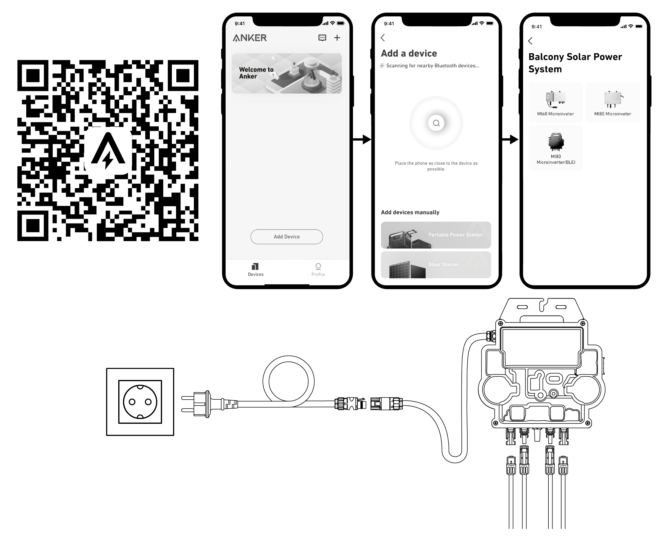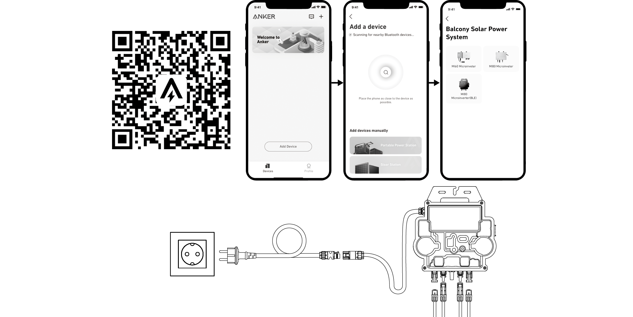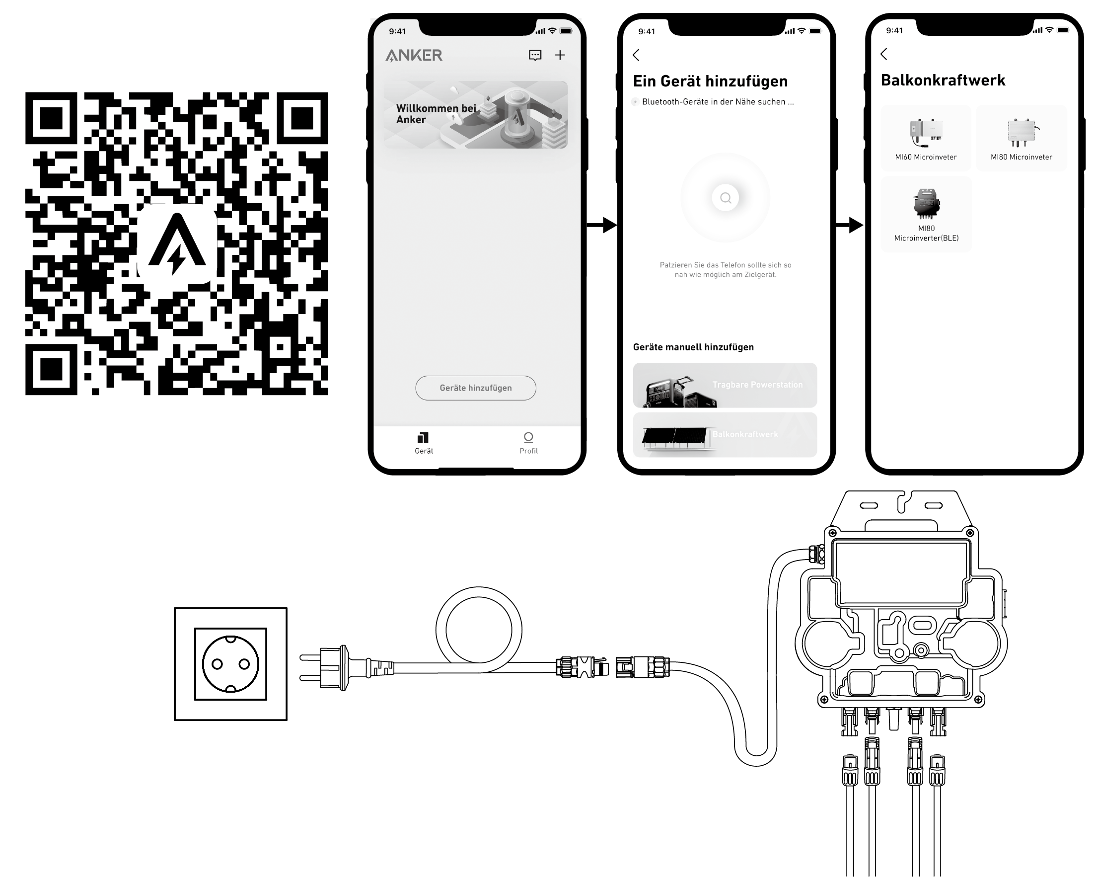 • Paso F: Escanee el código QR y descargue la aplicación Anker. Siga las instrucciones de la aplicación para completar la configuración del microinversor y realizar la conexión del cable Schuko.
