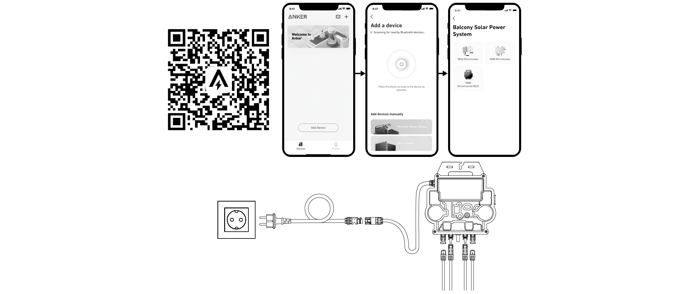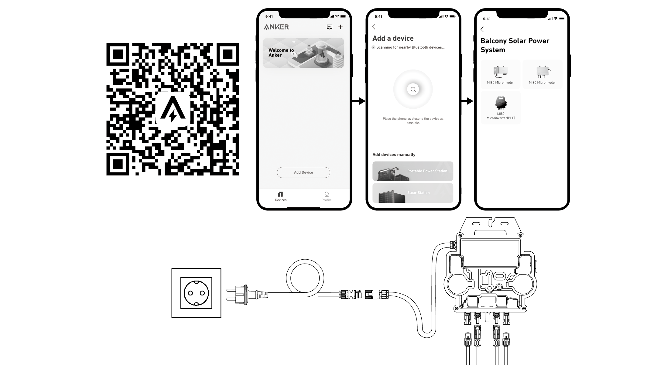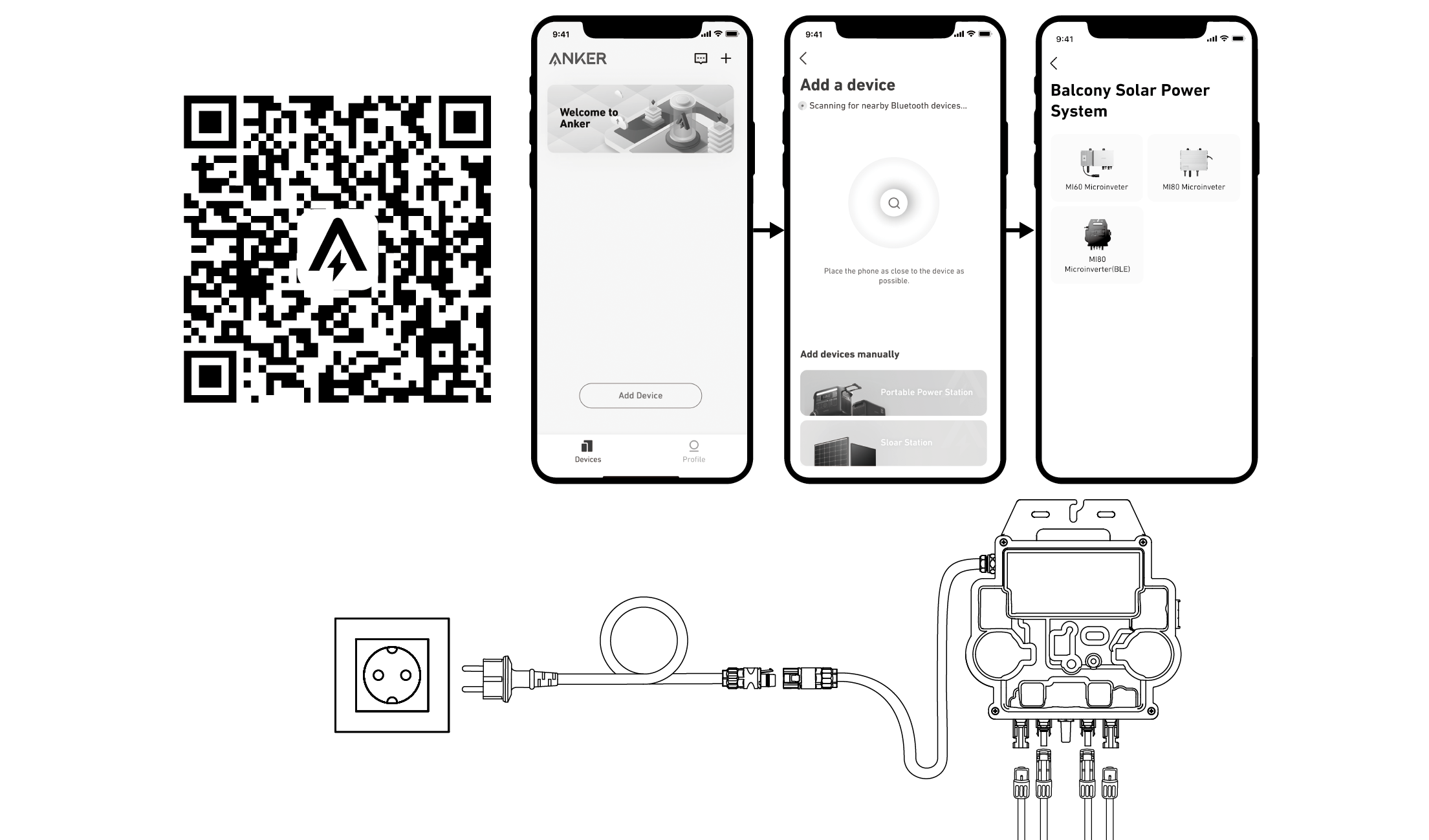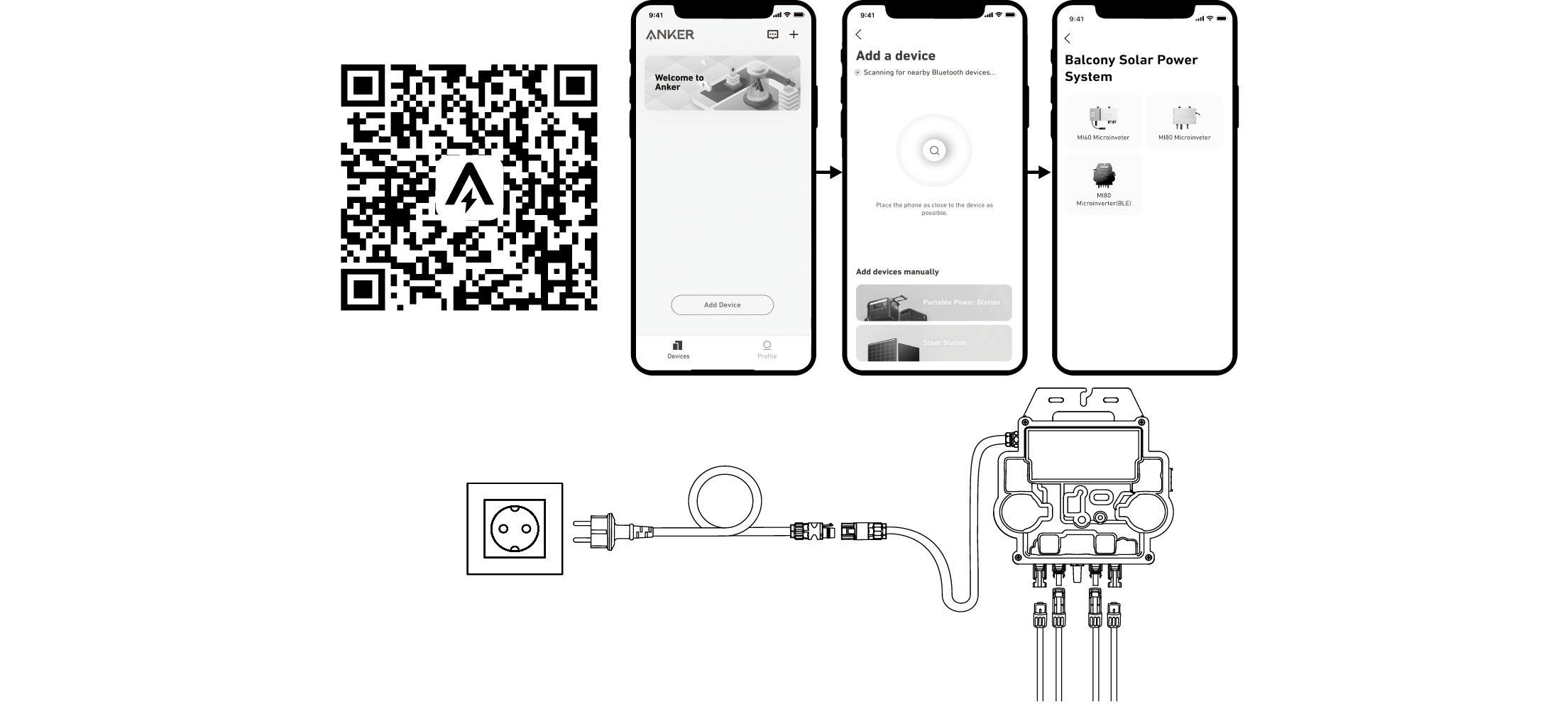 • Paso F: Escanee el código QR y descargue la aplicación Anker. Siga las instrucciones de la aplicación para completar la configuración del microinversor y realizar la conexión del cable Schuko.