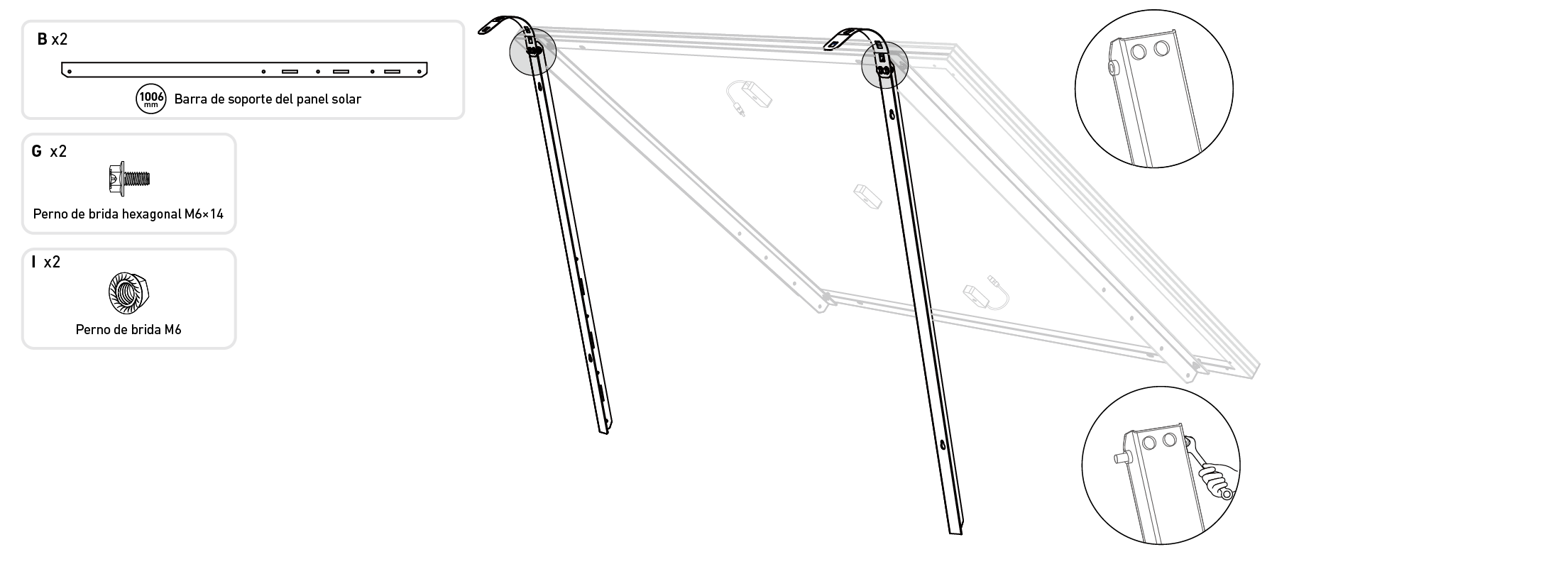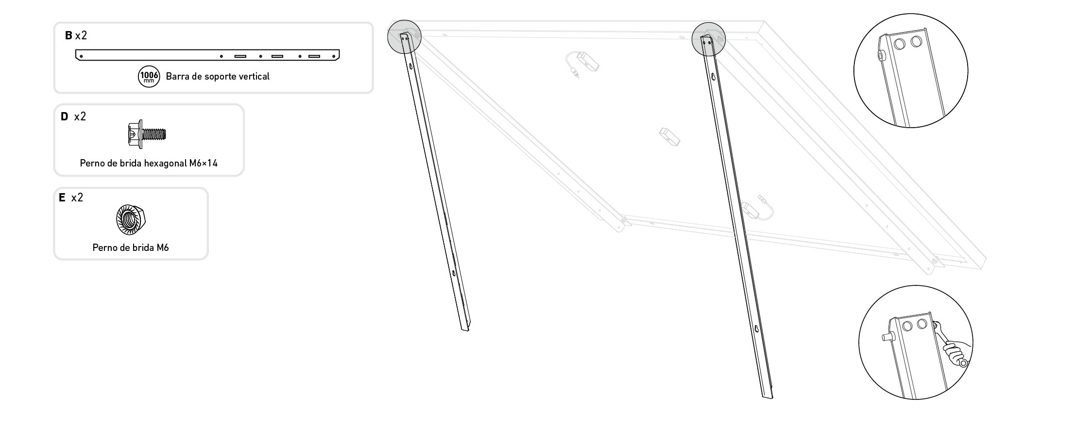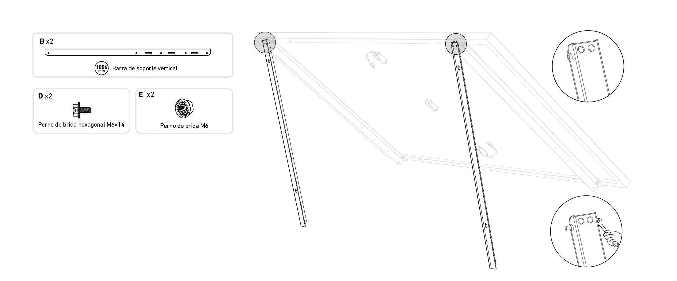 2. Instale las barras de soporte vertical y las barras de soporte del panel solar sin apretar los tornillos.