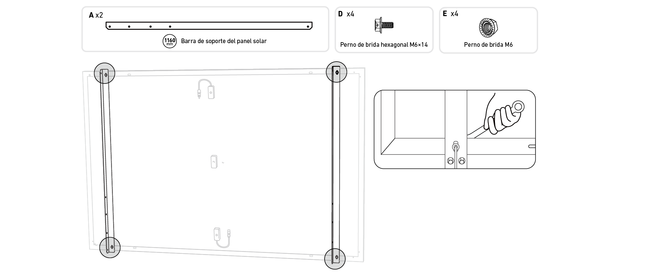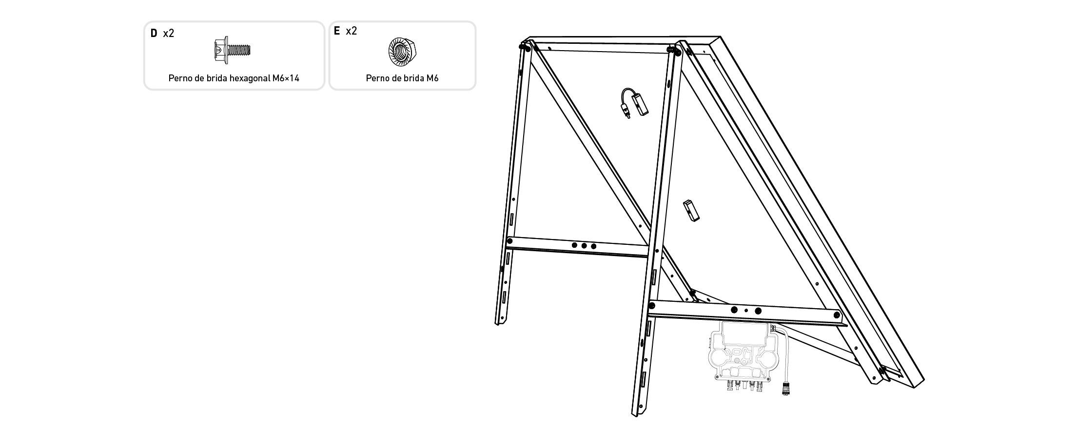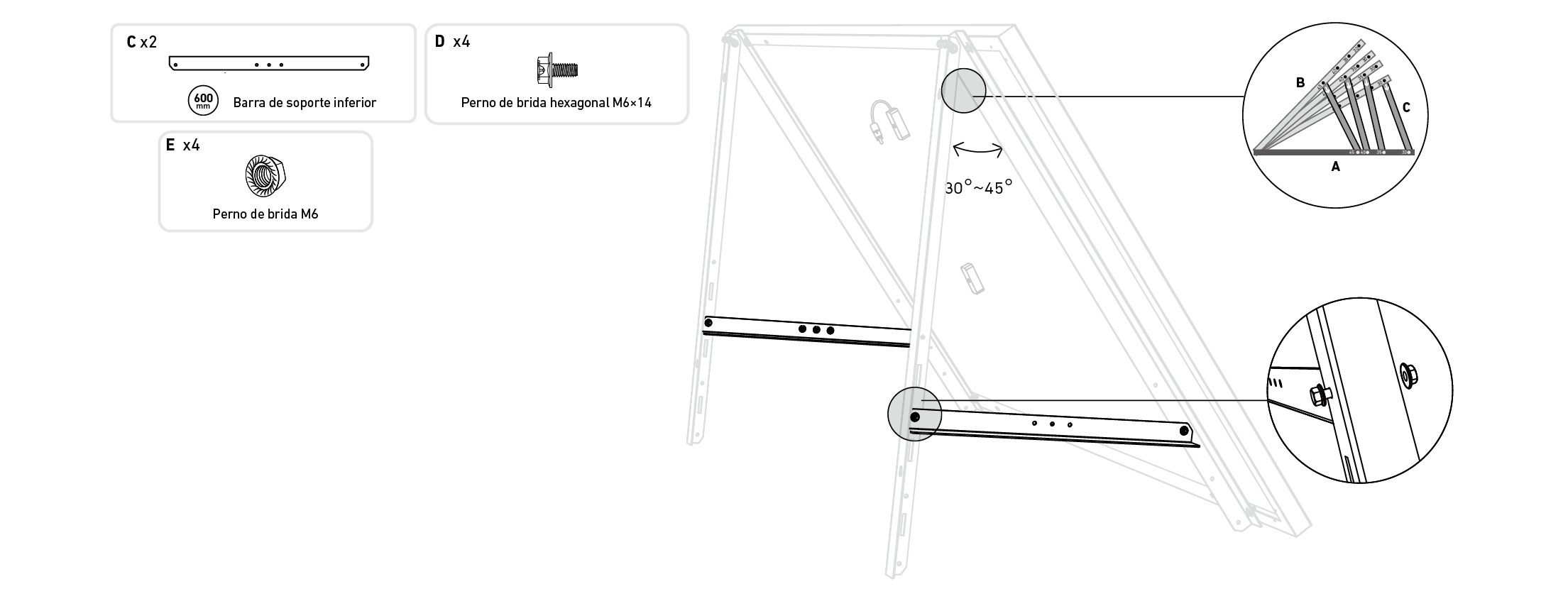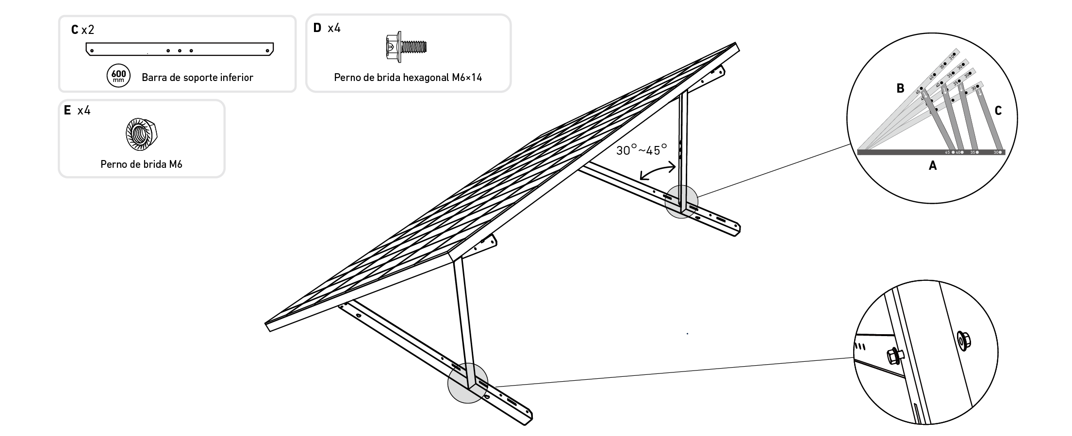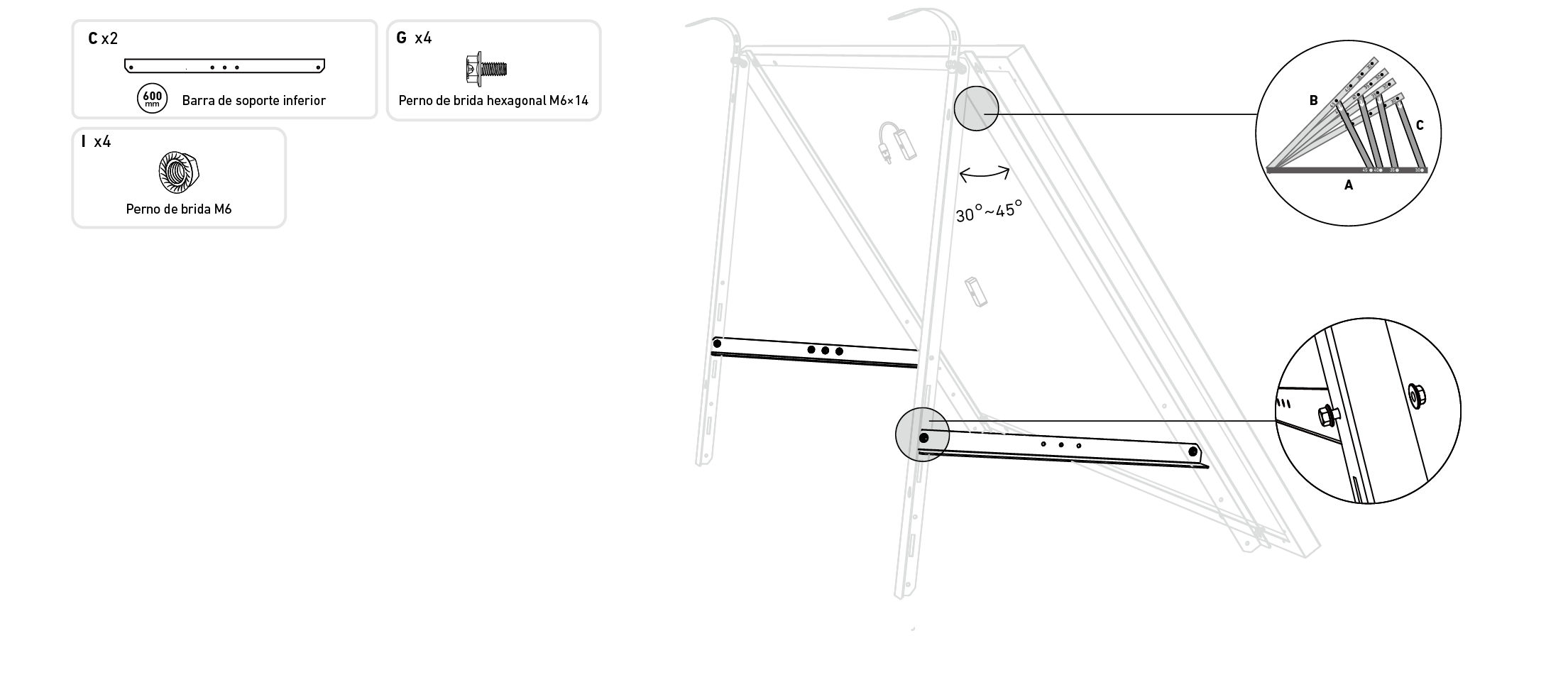 4. Coloque las barras de soporte inferiores y ajuste el ángulo para conseguir la máxima exposición a la luz solar.