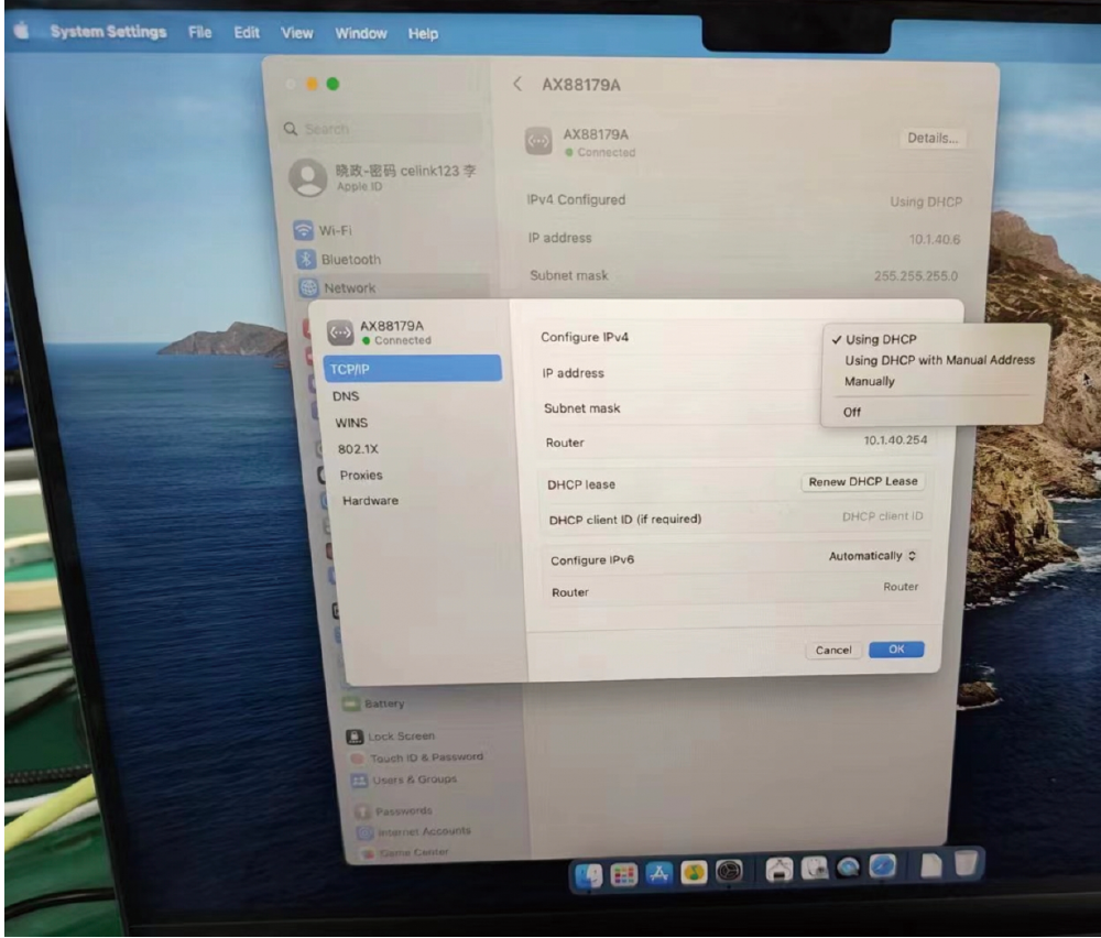 Ethernet-porten fungerer unormalt: Konfigurer din MacBook baseret på det vedhæftede billede.