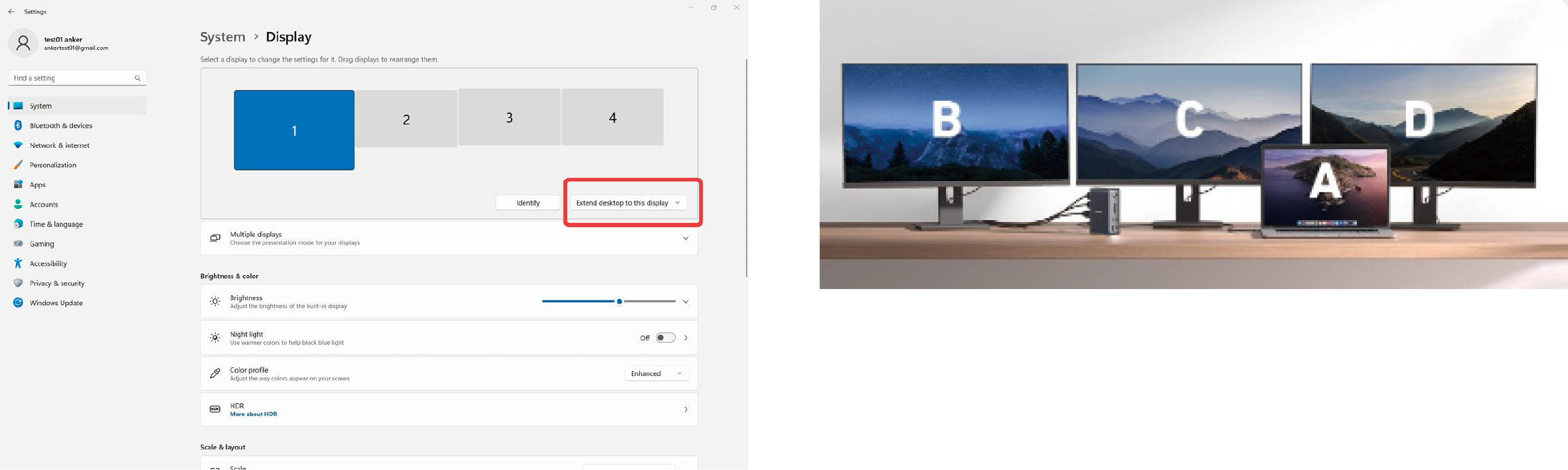 Vis forskelligt indhold på hver af de fire skærme, inklusiv bærbar computer.