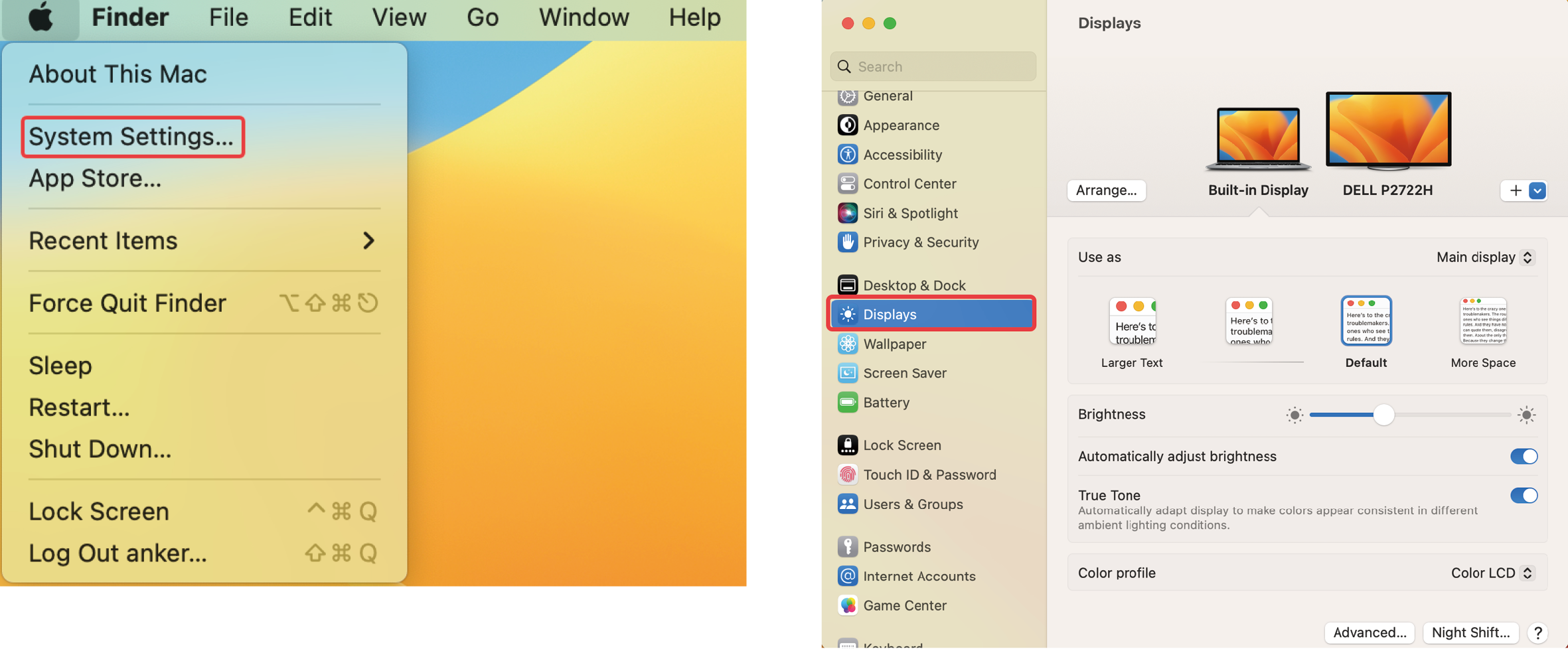 1.Conectați laptopul și monitoarele prin intermediul hub-ului. Apoi, faceți clic pe logo-ul Apple din colțul din stânga sus, urmat de "Setări sistem" și "Ecrane".