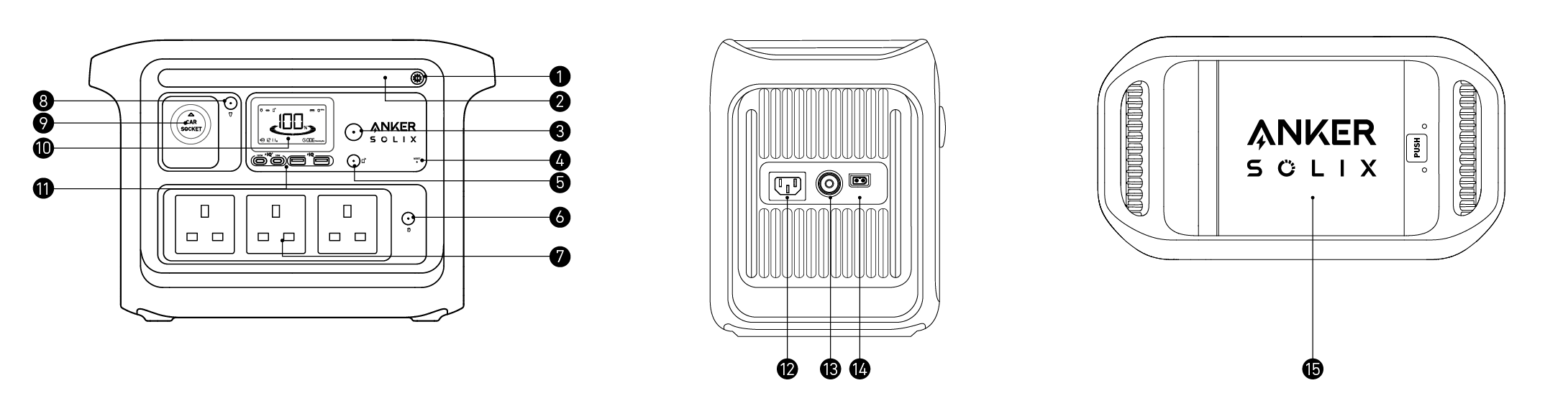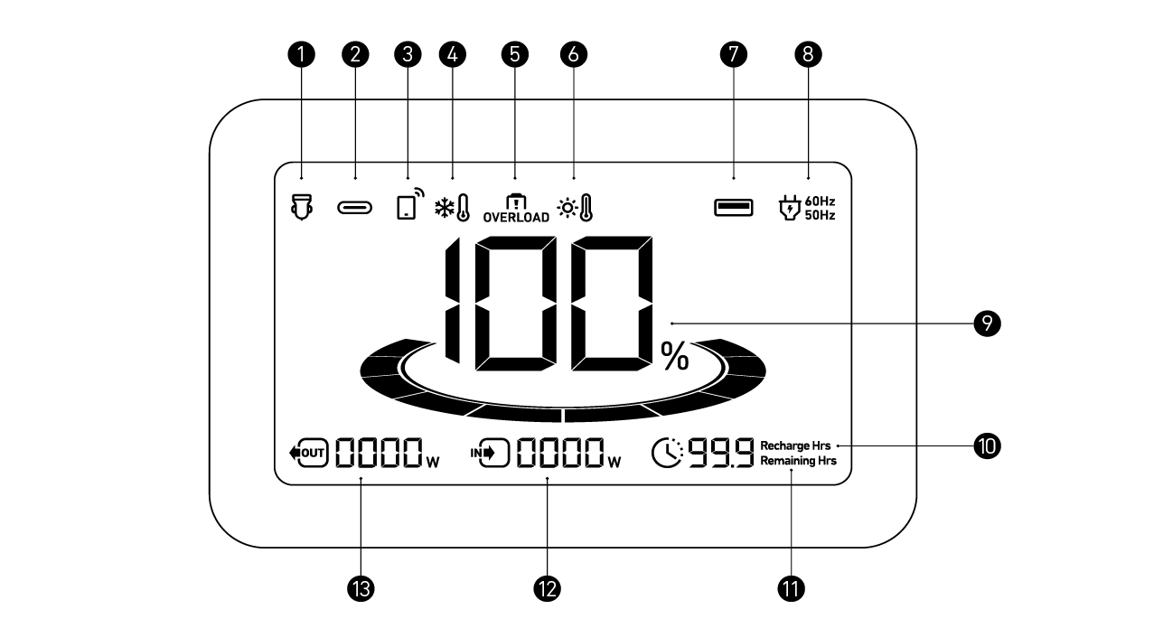 عند التشغيل، اضغط على زر الطاقة الرئيسي لتشغيل الشاشة أو إيقاف تشغيلها. سيتم إيقاف تشغيل الشاشة تلقائيًا بعد 30 ثانية من الإضاءة.يمكن تعيين وقت الإيقاف التلقائي في تطبيق Anker. سيتم إيقاف تشغيل محطة الطاقة تلقائيًا إذا تم إيقاف تشغيل أزرار الخرج ولم يتم اكتشاف أي أحمال طاقة بعد مرور مدة 12 ساعة.يمكن تعيين مدة الاستعداد في تطبيق Anker. |