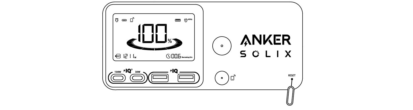 إذا لم تعمل محطة الطاقة الخاصة بك بشكل صحيح، أدخل دبوس أو مشبك ورقي في ثقب إعادة التعيين لمدة ثانية واحدة لإعادة الضبط المصنعي. إذا لم تعمل محطة الطاقة بعد، يرجى الاتصال بـ support@anker.com.