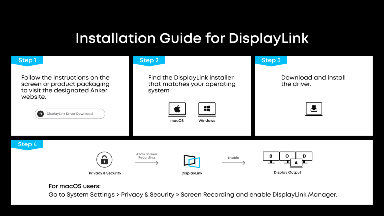 - Mac Users (Set Permissions): After installing the software, Mac users must also go to System Settings > Privacy & Security > Screen Recording. Then locate DisplayLink and toggle it on. This is required to allow the dock to display your screen content. Rest assured—your personal data will not be recorded or shared.