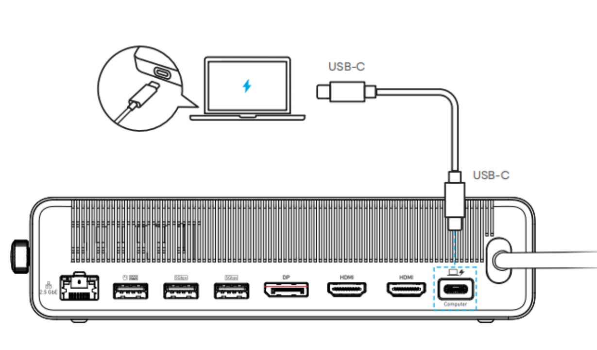 Connect Your Laptop: Use the included USB-C to USB-C cable to connect your laptop to the upstream port on the dock. This port is labeled "Computer" or marked with the computer icon.