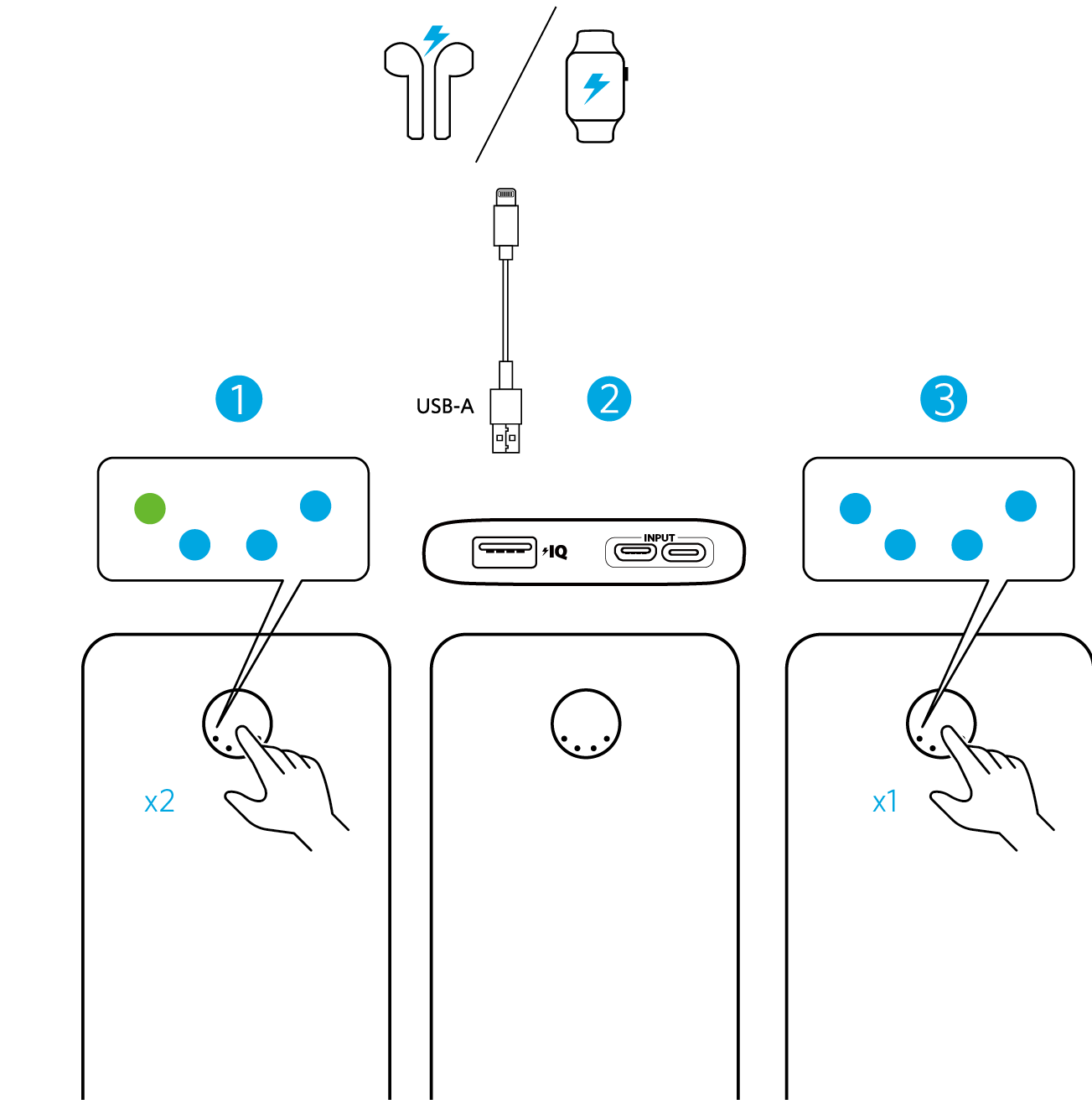 ① הכנס למצב "טעינה טיפולית": לחץ על כפתור ההפעלה פעמיים או לחץ והחזק למשך 2 שניות. האינדיקטור LED יהפוך לצבע ירוק.