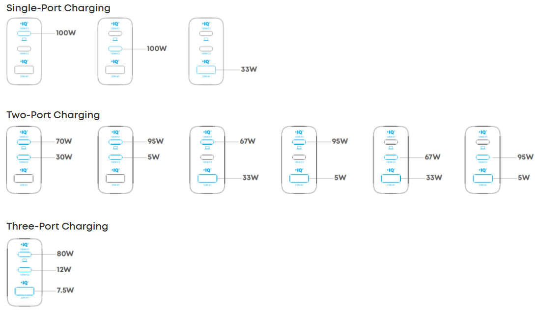 Die maximale Ausgangsleistung jedes Anschlusses in verschiedenen Nutzungssituationen ist in der untenstehenden Abbildung dargestellt. Wenn das Laden an zwei Anschlüssen gleichzeitig beginnt, ist die Standardverteilung entweder 70W + 30W oder 67W + 33W – das hängt davon ab, welche Anschlüsse du verwendest. Falls am Anschluss mit niedrigerer Leistung kein Ladeprotokoll erkannt wird (Spannung <6V und Strom <1A), schaltet das Ladegerät nach 1 Minute auf 95W + 5W um, um das Gerät mit höherem Leistungsbedarf besser zu unterstützen.
