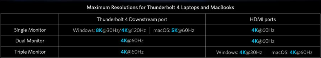Dreifachmonitor: 4K bei 30Hz (3840x2160) über beide HDMI-Ports und 4K bei 60Hz über den Thunderbolt 4 Downstream-Port.