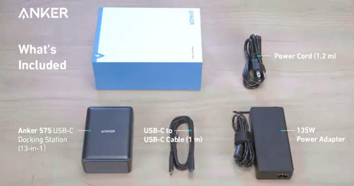 Die Box enthält vier Artikel: Anker 575 USB-C Dock, ein 135W Netzteil, ein 1,2m langes Netzkabel und ein 1m langes USB 3.1 Gen 2 USB-C-auf-C-Kabel.