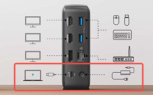 Um das Dock über einen USB-C-Anschluss, der Power Delivery und DisplayPort Alt Mode unterstützt, mit einem Laptop zu verbinden, befolgen Sie bitte die Schritte: