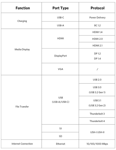 Im Allgemeinen haben USB-C-Hub-Anschlüsse 4 Hauptfunktionen und 8 Kategorien. Schauen Sie sich zunächst die folgende Tabelle an.