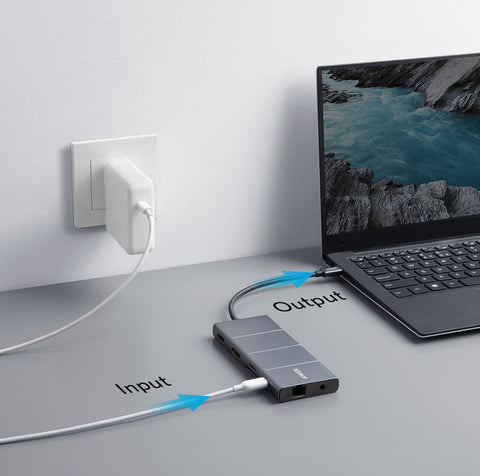 Glücklicherweise gibt es einige USB-C-Hubs auf dem Markt, die Power Delivery (PD)-Pass-Through-Laden unterstützen. Beim Pass-Through-Laden schließen Sie den Hub an Ihren Laptop an und verbinden dann das USB-C-Ladegerät Ihres Laptops mit dem PD-Eingangsanschluss des Hubs. Einige Hubs mit dieser Funktion können sogar Ladegeschwindigkeiten von bis zu 100W unterstützen.